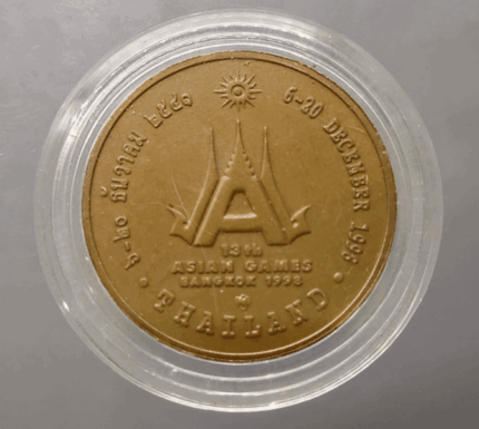 Bronze medal with black patina, depicting His Majesty the King sailing a Micro Moth, 13th Asian Games, 1998.