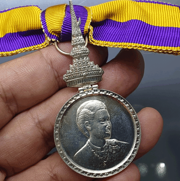A commemorative medal decorated with a ribbon, the Royal Ceremony of the Coronation of Her Royal Highness Princess Maha Chakri Sirindhorn, 1977, “Female Model”