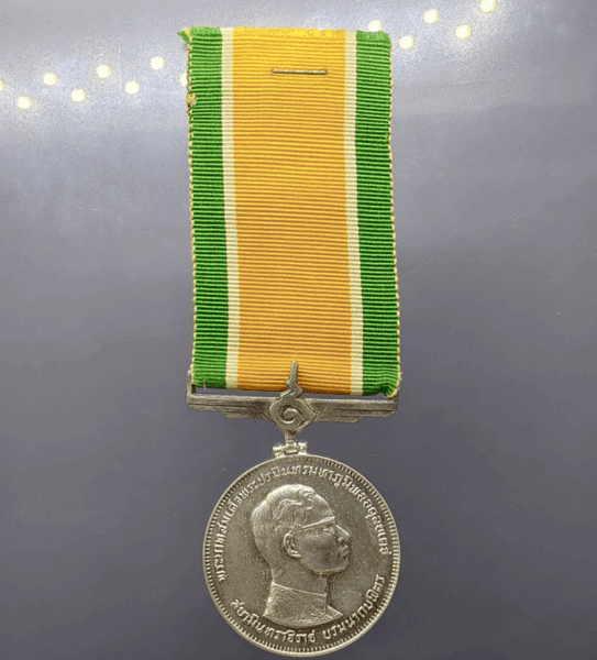Medallion decorated with ribbon, King Rama IX, commemorative of the 25th anniversary of the accession to the throne, 1971, silver (male style)