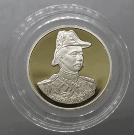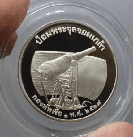 King Rama V coin, polished nickel, Royal Thai Navy souvenir, Fort Phra Chulachomklao, Royal Thai Navy mint block, created in 1994.