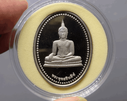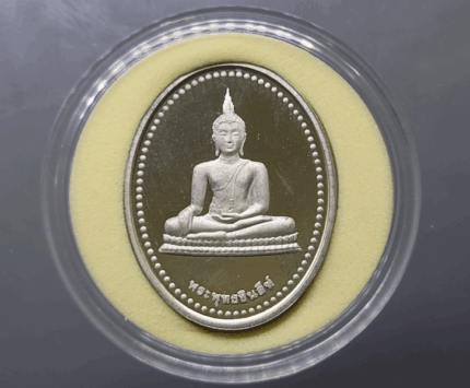 Phra Buddha Chinnasi, polished silver, commemorative item for the 70th birthday anniversary of His Holiness Somdej Phra Yanasangwon, the Supreme Patriarch, 1997.