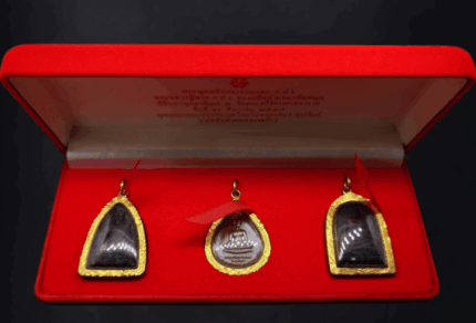 A set of amulets of Luang Pu Thuat, made from herbal powder, lotus petal shape – jackfruit petal shape, back with B.P.R. and Phra Phuttha Singhatham Mongkhon, framed in gold, consecrated at the Ubosot of Wat Phra Sri Rattana Satsadaram in 2004, with original box.
