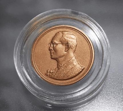 King Rama IX coin, Huganin, Swiss bronze, polished, commemorative of the construction of Phra Mahathat Chedi Phakdi Prakat, year 1996, with original box.