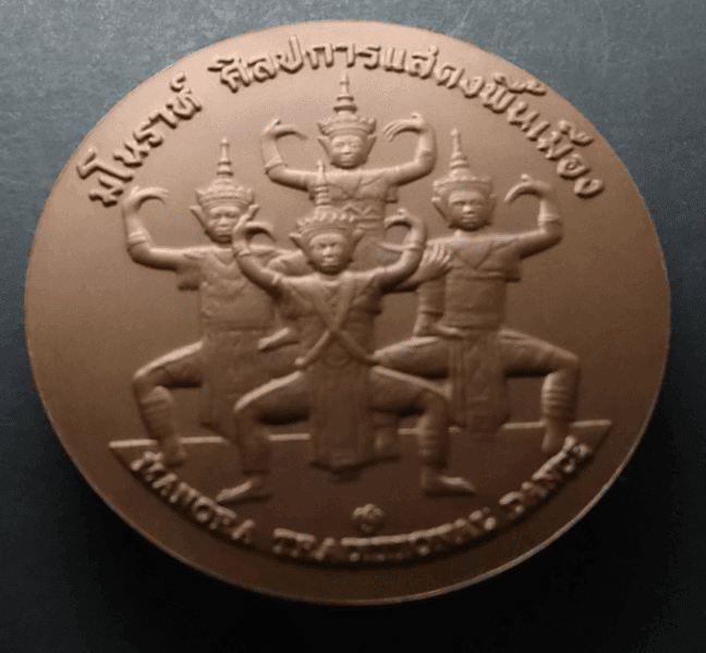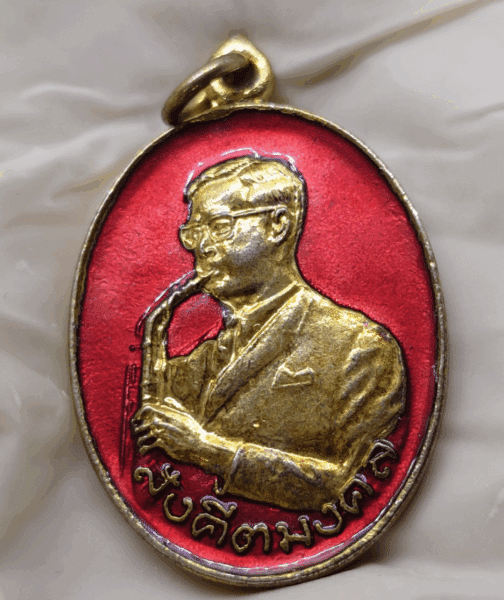 Auspicious musical medal with the royal inscription “The King plays music” on the back, made of gold-plated brass with red enamel, celebrating the 21st anniversary of the Music Association of Thailand, 1987.