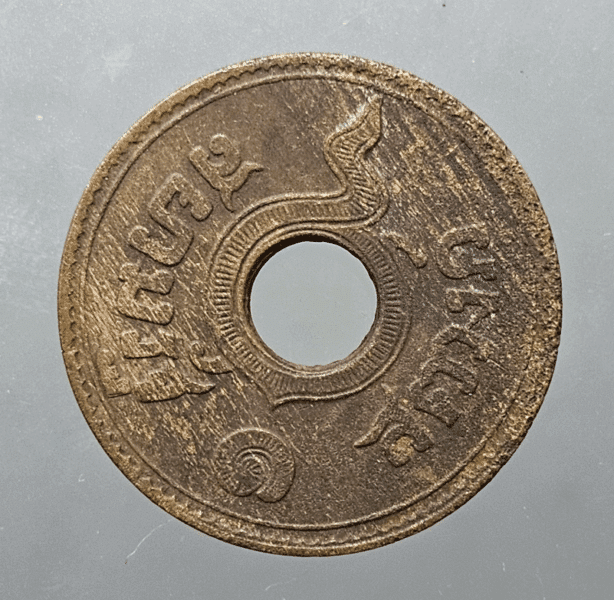 1 satang coin with hole, copper, Unalome – Phra Saeng Chak, year 1914, used