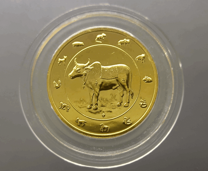 Copper zodiac coin, gold plated, Year of the Ox, 2009, minted by the Royal Thai Mint, uncirculated.