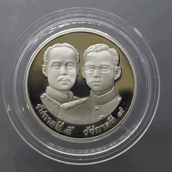 The obverse features a portrait of King Naresuan the Great engaged in an elephant duel with the enemy. The rim features the initials “King Naresuan the Great, Save the Nation.”