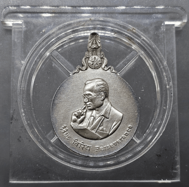 Above is a field marshal’s baton-shaped metal pin inscribed with the words “Victory.” The Victory Medal was created in 1945 during the reign of King Ananda Mahidol. It uses the abbreviation “Ch.S.” and was created in accordance with the Victory Medal Act of 1941 to bestow upon soldiers, police, or those who perform duties as soldiers or police who have been ordered by a military or police unit to go into battle and have already deployed to carry out their duties.