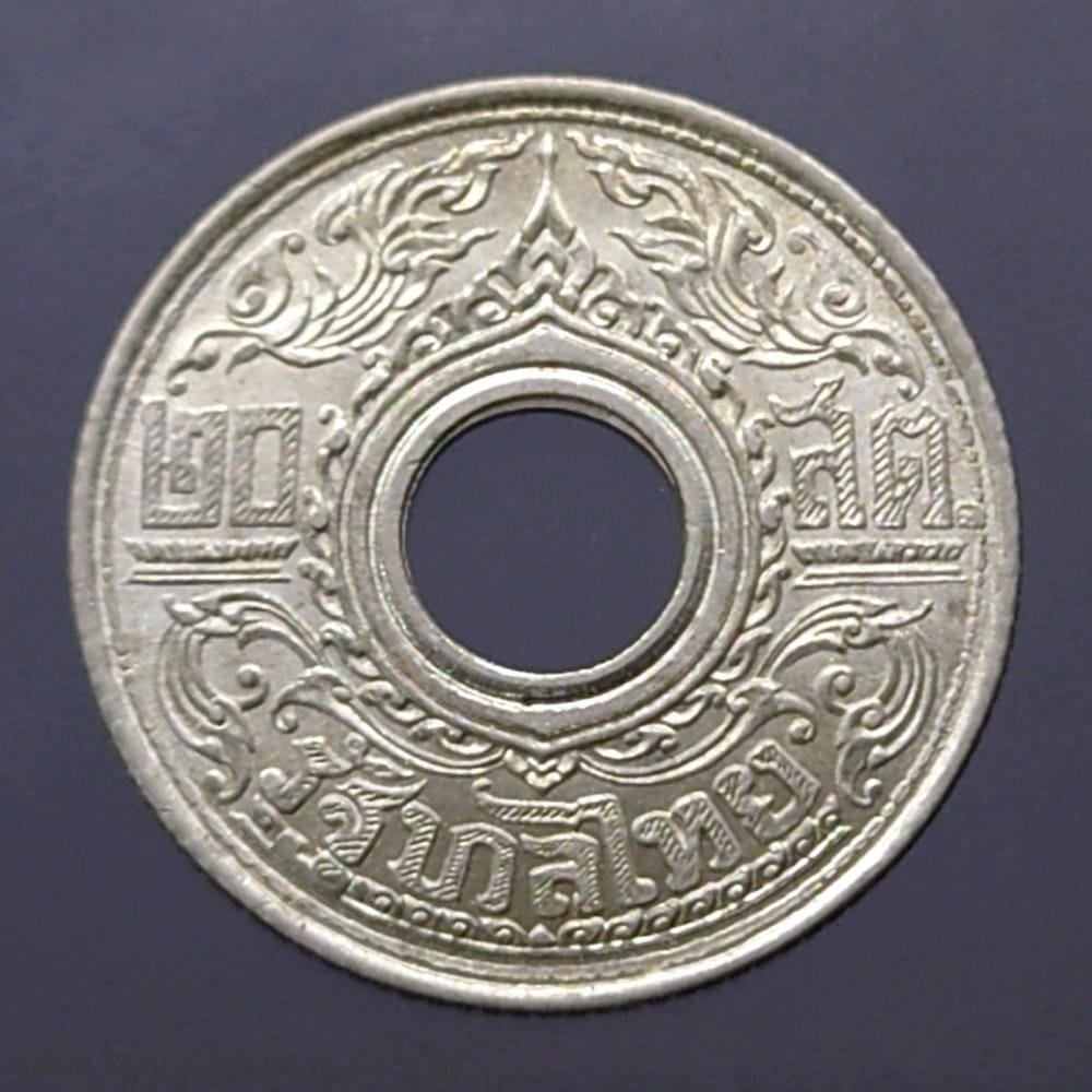 1942 – Silver coin, 20 satang, Kanok Khaeng Singh pattern, unused.