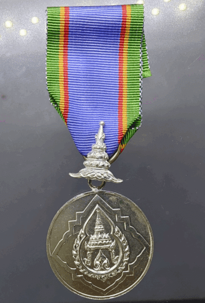 Silver Medal of the Crown of Thailand (R.N.M.) with the back of Chulachomklao Royal Military Academy, 7th Class, with ribbon and original box, male type