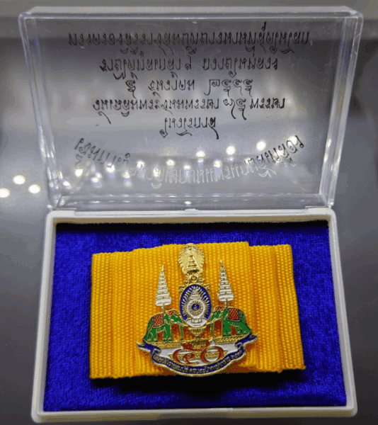 Golden Jubilee pin on yellow silk cloth, created on the occasion of the 75th birthday of King Rama IX in 2002, with original case, guaranteed authentic.