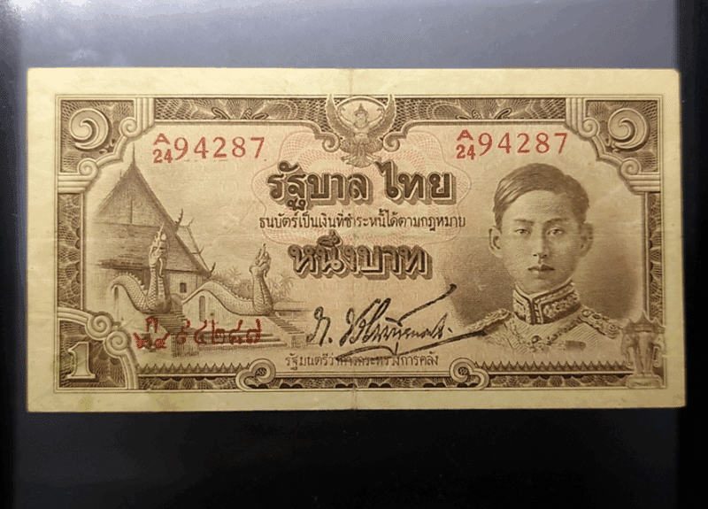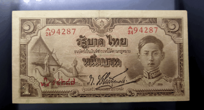 1 baht banknote, type 5, issue 1 (Wat Phumin), King Rama 8, 1942, used