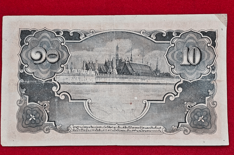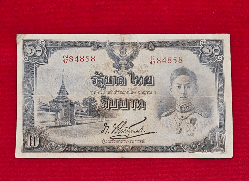 10 baht banknote, type 5, issue 3, from the reign of King Rama 8, 1944, used condition, very rare.